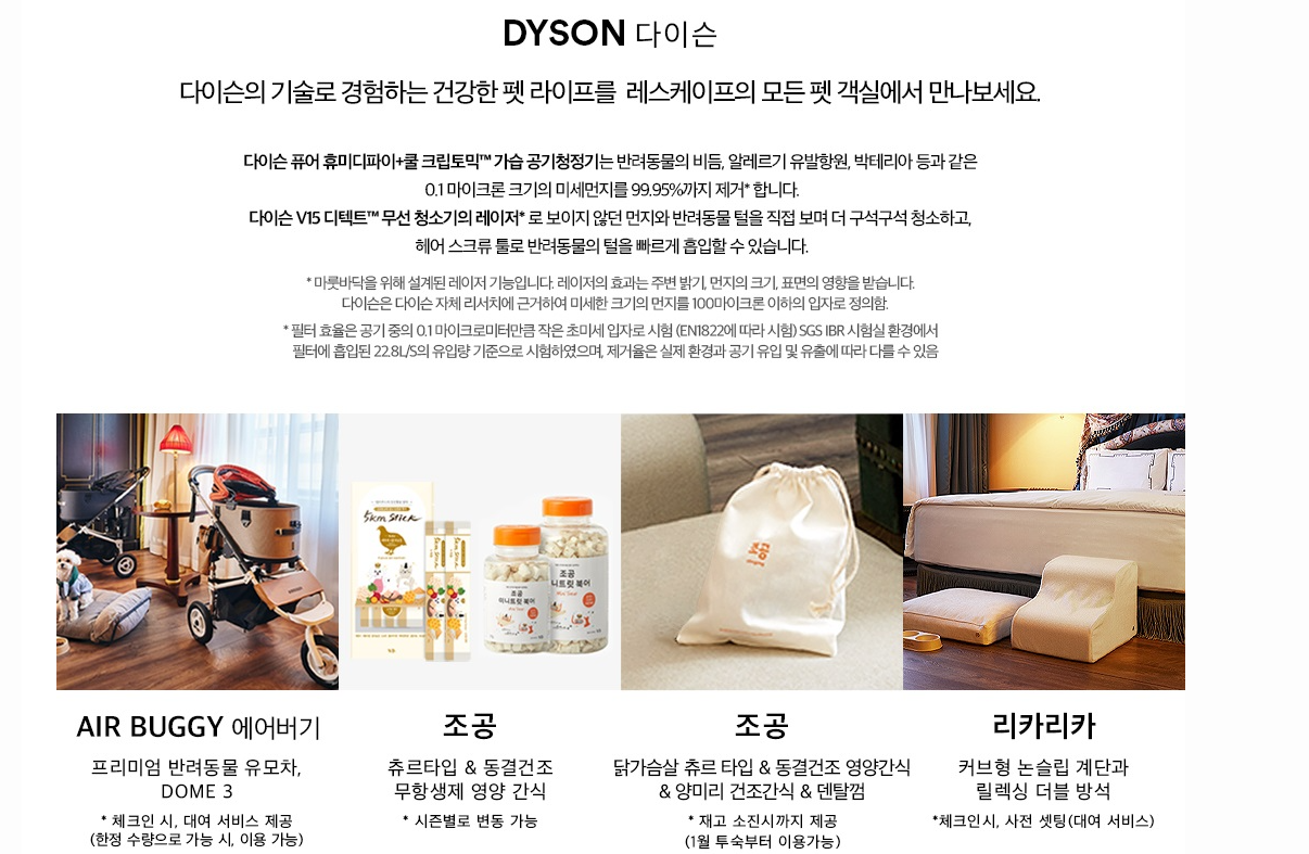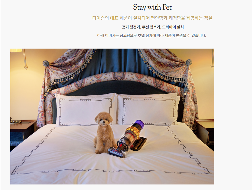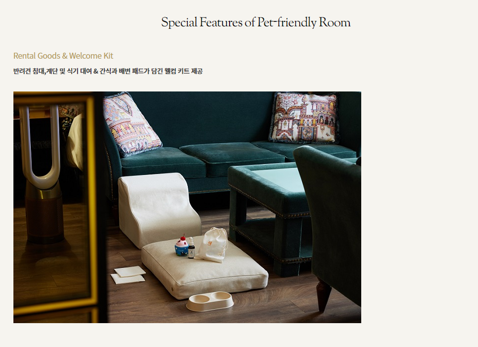 애완동물 객실을 사용하는 분들의 각종 혜택입니다. 객실마다 다를 수 있고 별도로 추가하는 부분도 있을 수 있으니 정확한것은 호텔에 문의해보세요.