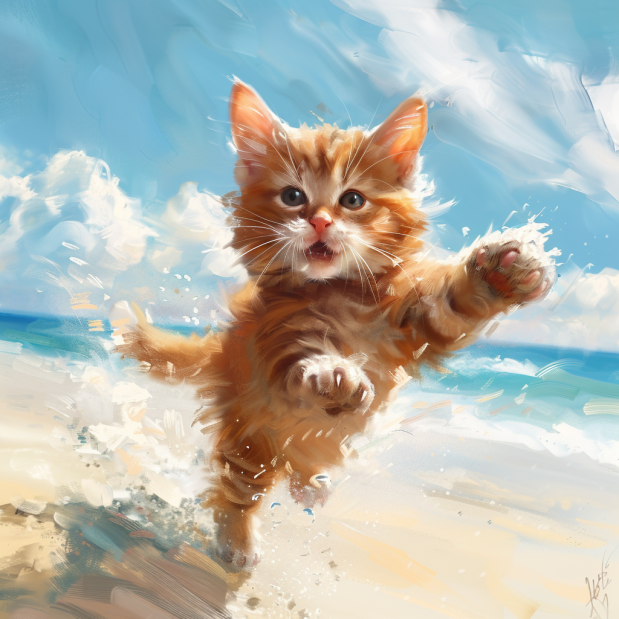 이 귀여운 아기고양이는 해변가를 신나게 뛰어놀고 있는 모습이에요. 해변가를 뛰어다니는 고양이라고 입력하면 이렇게